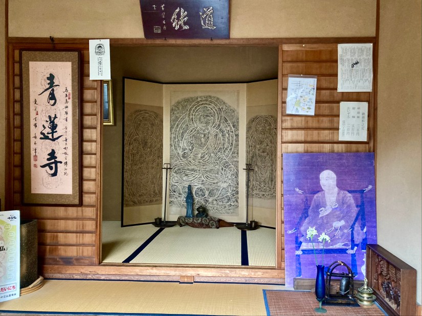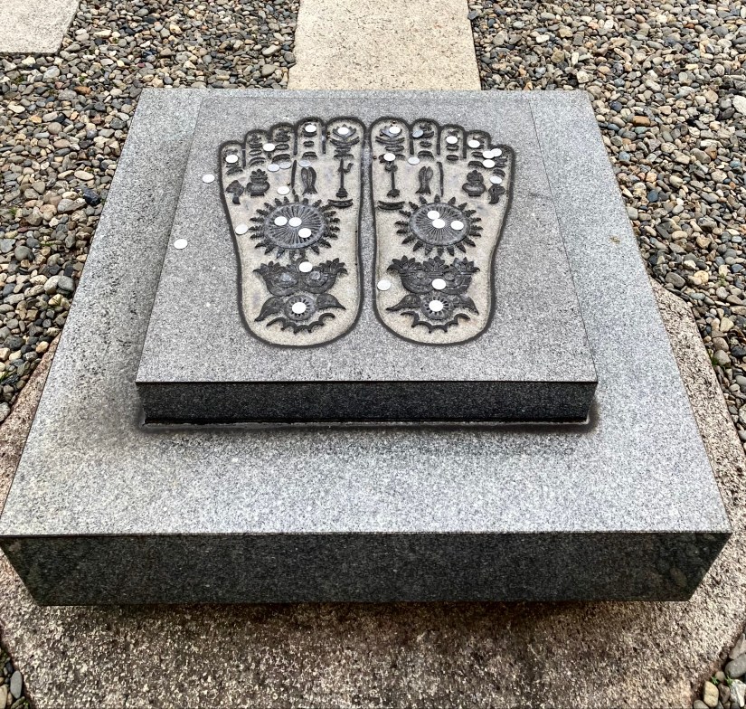Il Seirenji sta in fondo a una traversa. Alle tre del pomeriggio trovo il portale chiuso e un cartello che dice di entrare dal cancelletto scorrevole al lato. Non si apre, citofono e mi accoglie un monaco anziano. Pensa che lo abbia chiamato per il goshuin, il timbro e la firma calligrafa del tempio, cosa che certo mi fa piacere ricevere, ma soprattutto colgo l’occasione per rivolgergli una domanda che mi ronza da un po’ nella testa: qual è il criterio di numerazione dei templi? Purtroppo non conosce la risposta – mi dispiaccio, ma continuerò a cercare. Terminato il breve scambio, faccio un giro nel cortile. Trovo un bussokuseki 仏足石3, un piedistallo di marmo alto circa 30 centimetri con il bassorilievo delle piante dei piedi del Buddha, simbolo del suo passaggio sulla terra e della sua presenza nel Dharma, l’insegnamento. Alcune monetine da un centesimo di yen sono poggiate in offerta negli incavi del rilievo, il contrasto cromatico fra il grigio chiaro del metallo e quello della pietra mi ipnotizza.