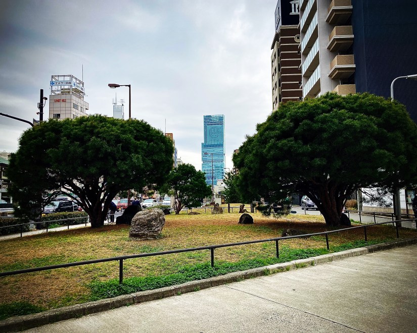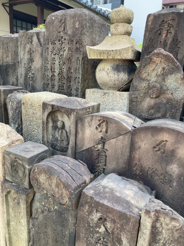 La prima volta che sono entrata allo Shinkōin ero stata attratta dai pini meravigliosamente potati davanti al suo ingresso. Mi fermo a guardali, come ho fatto altre volte; in prospettiva c’è l’Abeno Harukas. Da questo punto di osservazione trovo particolarmente piacevole stare a vedere come cambia colore in accordo col cielo. Infine, per completare la visita, supero il portale e mi ritrovo in un recinto stretto, costellato di statue e lapidi – fra le tante un Doraemon di pietra. Il cortile si affaccia sulla pagoda del santuario che sta nel pendio sottostante5. Un suono sommesso di piccole sfere strofinate fra loro riempie l’aria: un monaco prega in tondo davanti alle lapidi, sfregando fra i palmi un rosario buddista. Mi sposto per lasciarlo passare.