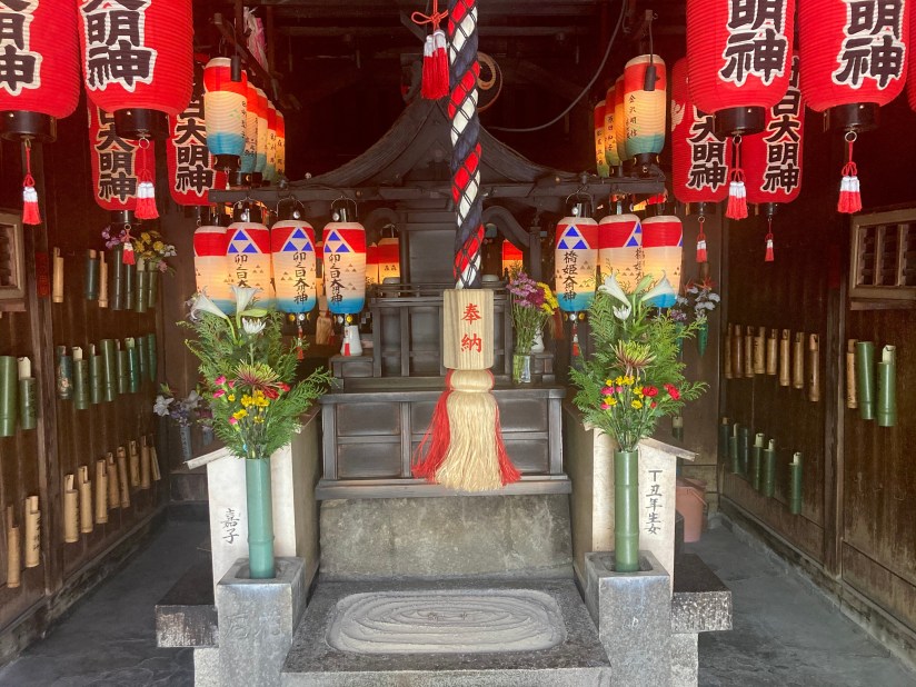 Fra questo piccolo santuario e il precedente se ne trovano molti altri disseminati lungo entrambi i lati della strada e nelle laterali. Le possibili deviazioni sono infinite, ci vorrebbe più di una mezza giornata per scavare nei tesori della Tanimachi-suji. Entro o procedo? All’esterno di uno dei tanti santuari c’è la scritta jūsan mawari十三回り, giro dei 13 (templi), un percorso più breve del mio. Resisto alla tentazione di cambiare strada e tiro dritto, una cosa per volta.
