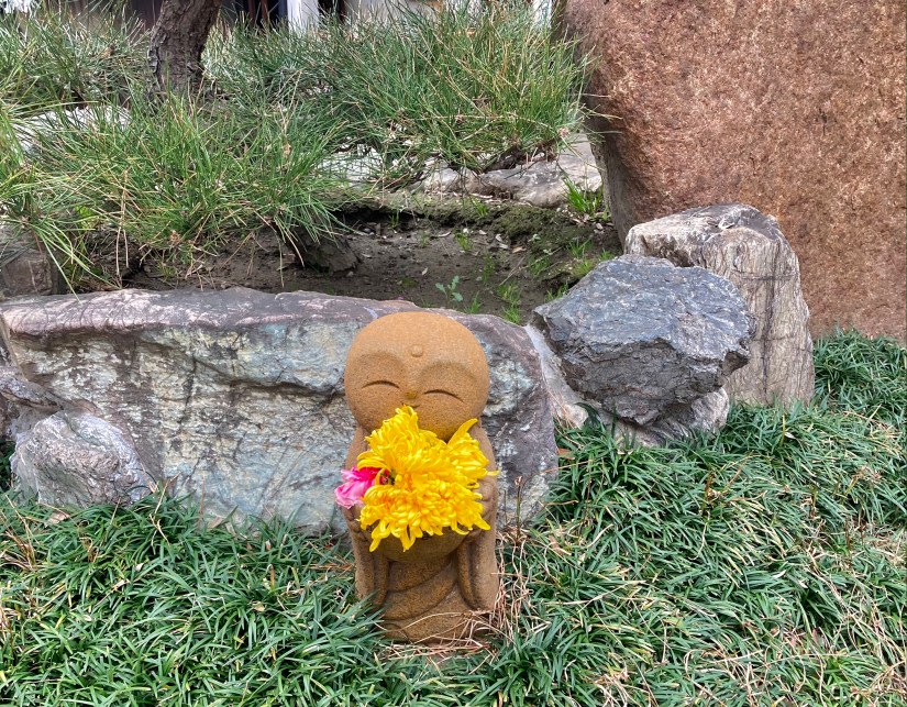 Il Tōjiji sorge all’incrocio fra la Sennichimae e la Tanimachi-suji, crocevia di un’intima memoria: un semplice appuntamento con due amiche una sera di giugno, l’aria densa del tramonto, la gioia di vivere mista a una malinconia lontana per il tempo che scivola via. All’esterno tutto è nuovo e rosa pesco con delicate linee bianche che tracciano i fianchi del recinto. Spiccano il portale rosso e nell’inquadratura dell’ingresso un minuscolo monaco di pietra, forse Jizō, ornato con un mazzolino di crisantemi gialli.