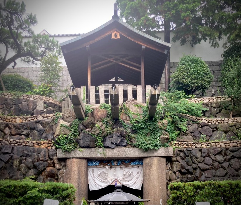 Mi siedo, osservo, consulto la guida – la signora anziana intanto continua a girarmi intorno, o meglio a girare attorno al padiglione. Leggo: «Se scendi i gradini di pietra di fronte alla sala principale, raggiungerai la cascata Tamade, l’unica naturale nella città di Ōsaka.» Beh cascata, che esagerazione, sono appena tre rivoletti! Eppure….eppure se, come è scritto, la fonte è veramente l’acqua dello stagno all’ interno dello Shitennōji – il grande complesso a cui il Kyomizudera appartiene – forse la definizione non è completamente errata. Ma come verificare? Concludo che non potrò mai sapere la verità su questa faccenda ed esco dal tempio con l’impressione di venire fuori da una dimensione fiabesca (la signora intanto ha concluso le preghiere e mi ha salutata con un profondo inchino). All’esterno mi metto a seguire un gatto paffuto che spero voglia mostrarmi il quartiere. Quello però, diffidente, va a nascondersi chissà dove.