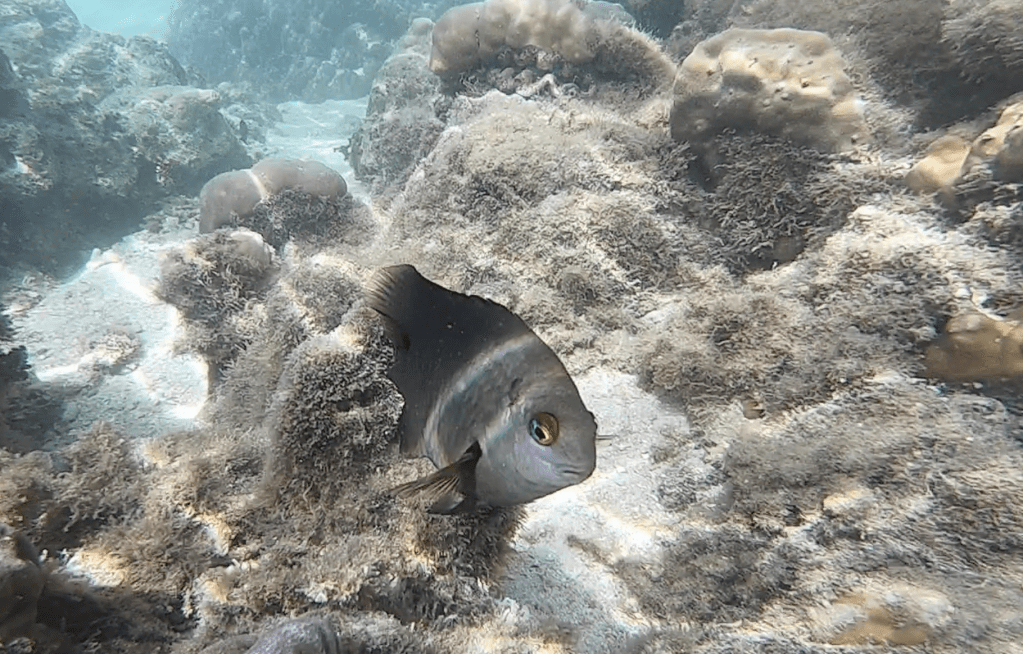Iniziamo a nuotare a filo del fondale dove ci sono coralli panciuti violetti o bruni, porosi e piacevolmente ruvidi. Si sporge dalla tana una murena quel tanto che basta perché la luce che filtra la accechi e spalanchi la bocca minacciosa. L’istruttore mi fa segno per domandare se l’ho vista; gli sorrido come posso da dietro la maschera e metto le mani a forma di cuore. In quel punto, alla nostra destra, si apre una fossa dove l’acqua diventava più fitta e più azzurra, piena di pesci che guizzano come specchietti iridescenti. Scendiamo ancora, quasi a testa in giù, col suono regolare del respiro nelle orecchie e nello sciabordio dell’oceano uno sfrigolare leggero di bollicine che scoppiettano. Ancora rocce, sabbia e prati marroncini di Padina pavonica, un’alga che si apre come sfoglie di matita temperata. Una miriade di pesci, qua un lumacone marino che mi ricorda un salsicciotto paraspifferi, là una Blenniella chrysospilos, che ci guarda, un po’ rospo un po’ pesce, adagiata sul fondale. Silenzio eppure musica. Timore dell’ignoto eppure gioia.