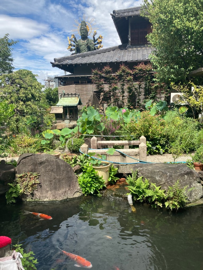 E a proposito di determinazione, l’ora di pranzo è passata da un pezzo e fa caldo, ma procedo fino all’ultima tappa. Paragonato al Kōtokuj, il Zenpukuji appare austero. Per accedere alla sala delle cerimonie bisogna salire una scala ripida, cosicché per vederla, entrando nello stretto cortile, bisogna piegare il collo all’indietro. Salgo la scala. Il monaco mi firma il diario e mi racconta di aver compiuto in 40 giorni il pellegrinaggio degli 88 templi dello Shikoku -un cammino tra i più celebri. Gli dico del mio pellegrinaggio in città. Dopo la firma mi regala alcuni snack e una bevanda e mi lascia entrare a scattare qualche foto. La gentilezza inaspettata allevia un po’ la stanchezza. All’uscita mi colpisce la statua di bronzo di una mamma con bambino vestiti e acconciati in modo tradizionale. La scritta dice “punto di incontro di Oyumi お弓(arco) e Otsuru お鶴 (gru), mamma e bambino”. Arco e Gru? Per un po’ resto perplessa, poi da qualche angolo della memoria emerge il ricordo: si tratta di un’opera teatrale che narra di una separazione e ricongiunzione fra una madre, costretta a seguire il marito e ad assumere il falso nome di Oyumi, e una figlia, Otsuru, che cerca i genitori e alla fine li ritrova. E su questo “tutti vissero felici e contenti” mi pare giunta l’ora di tornare a casa.