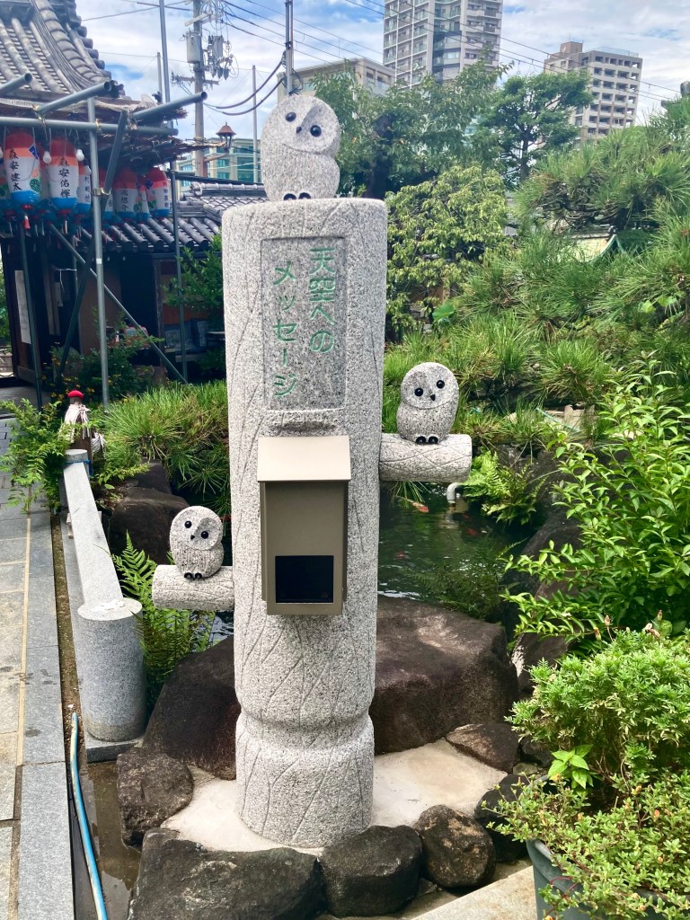 In un periodo non meglio precisato della storia invece fu eretto il Kōtokuji (la documentazione relativa al tempio perì in un incendio e con essa la memoria della fondazione). Il santuario attuale è tutta la somma della grazia e della cura per i dettagli assente nei templi-rispostiglio: ci sono uno stagno limpido per le carpe, un’ imponente statua di Kannon 観音2 che si vede dall’ingresso e poi statue e statuette di ogni tipo. Gufi soprattutto, gli animali in grado di vedere nella notte e perciò di prevedere le sfortune; gufi ai bordi del laghetto, gufi appollaiati su una curiosa cassetta della posta. Mi avvicino e leggo : tenkū he no messēgi 天空へのメッセージ, messaggio al cielo. Vorrei imbucare una breve missiva, ma cosa scrivo? Cosa conta veramente? Ho sempre pensato che per far sì che un desiderio si realizzasse, dovessi trovare la formula esatta, abbastanza sintetica da poter essere detta nel baleno in cui cadeva una stella, ma che non trascurasse nulla. E adesso, su due piedi, non riesco a mettere a fuoco i pensieri. Mi allontano per riflettere e mi ritrovo nel cimitero sul retro. Le lapidi sono tutte decorate da fiori che hanno appena cominciato ad appassire, l’obon お盆, il periodo in cui gli avi tornano a visitare i vivi, è trascorso da poco e l’estate volge al termine. Sollevo la testa, le nuvole passano spumose. Rimango per un po’ a guardarle con un velo di nostalgia. Quando torno indietro ho deciso: nel messaggio scriverò una promessa, perché non sempre, ma spesso, i desideri si realizzano attraverso la determinazione.